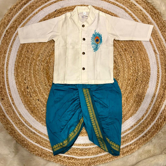 Baby Boy Krishna Dress - White and Sky blue feather embroidered kurta dhoti ethnic dress for baby boy