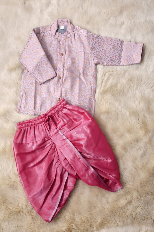 Cloudy grey and blush pink banarasi silk kurta dhoti ethnic wear for baby boy