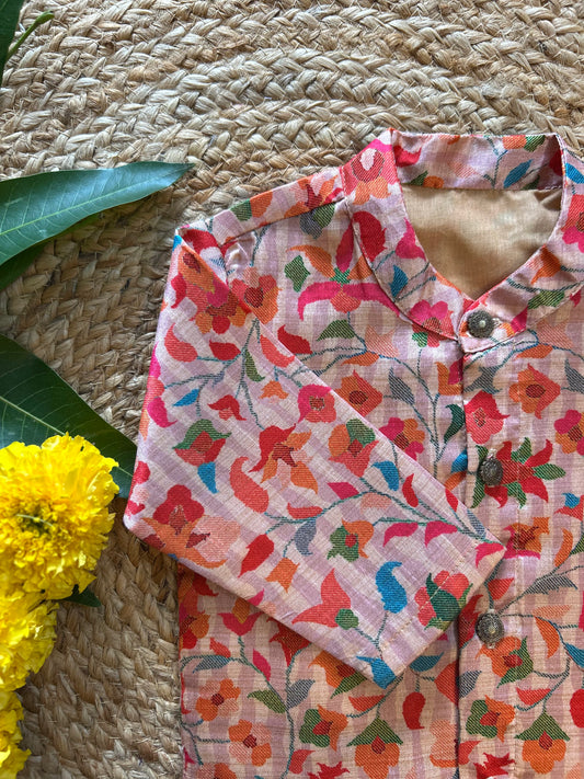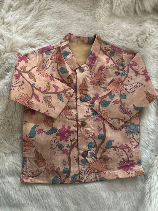 Kalamkari Indian Print Cream Floral Semi silk kurta baby boy ethnic top wear