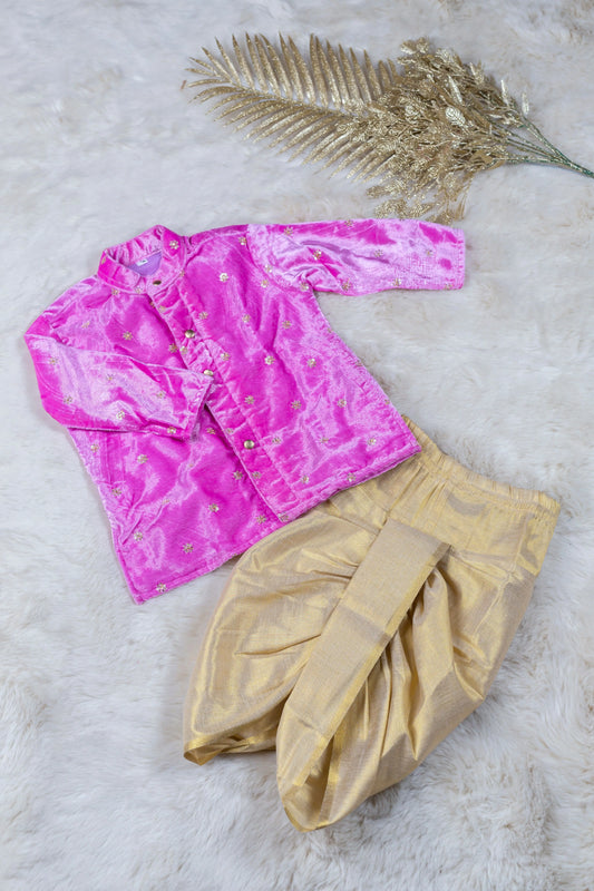Velvet Baby Pink with gold Kurta Dhoti ethnic wear for baby boy