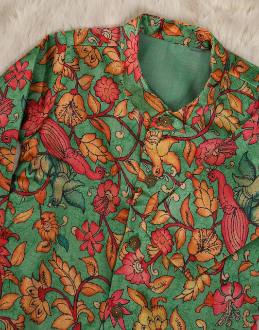 Traditional Indian Kalamkari Musk Lorikeet green Silk Dhoti Kurta for Baby Boys | Ethnic wear for boys