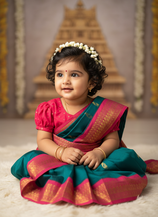Bottle green and pink - Ready to wear muttukattam saree for kids Ethnic wear for baby girl