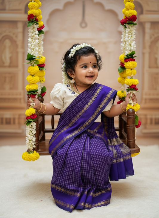 Purple checked muttukattam saree with white blouse - Ready to wear saree for kids Ethnic wear for baby girl