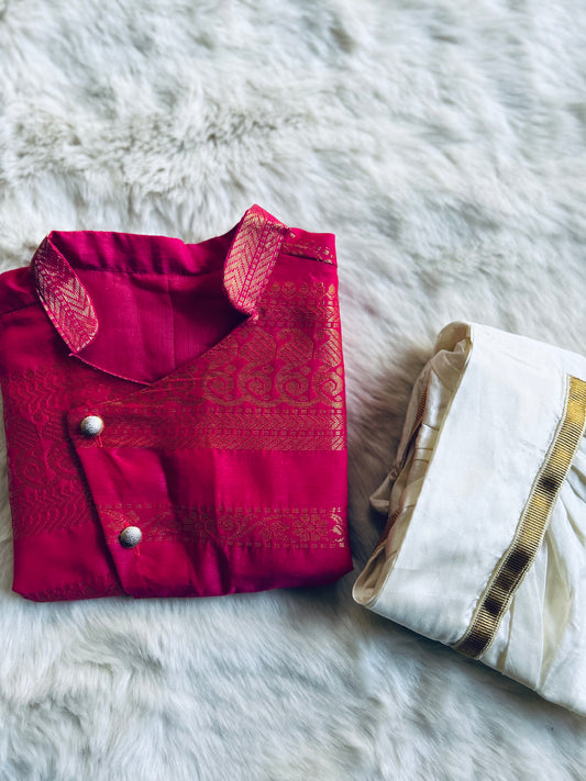 Traditional Indian Kalamkari Neeli Baby Boy Silk Kurta golden pink Dhoti Set