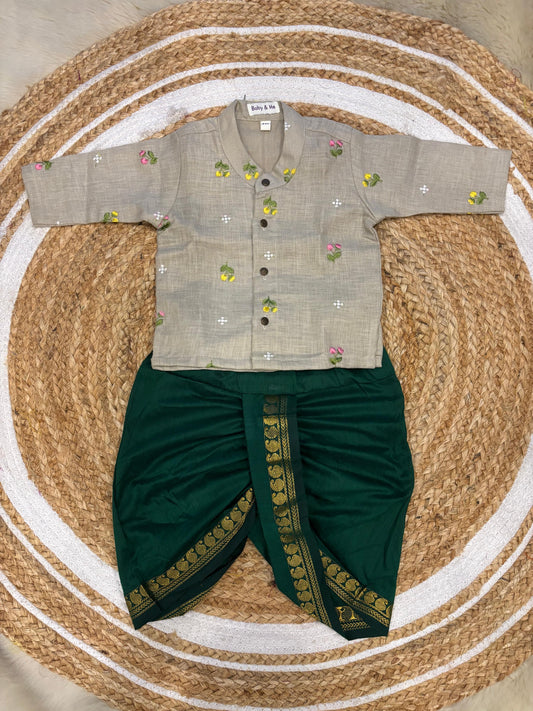Pure Linen Light Grey with Bottle green Kurta Dhoti for baby boy