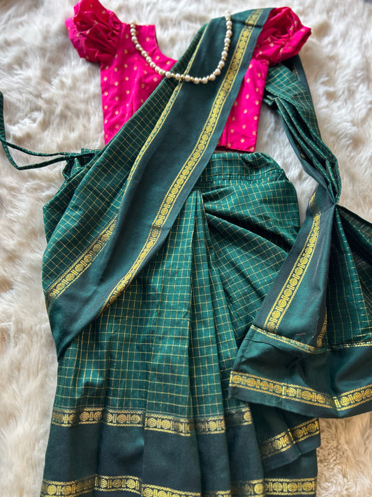 Bottle green with festive pink - Ready to wear muttukattam cotton silk saree for kids Ethnic wear for baby girl