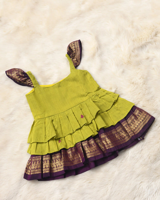 Green with wine - Cotton Silk 3 Layered South Indian Ethnic Frock for Baby Girl