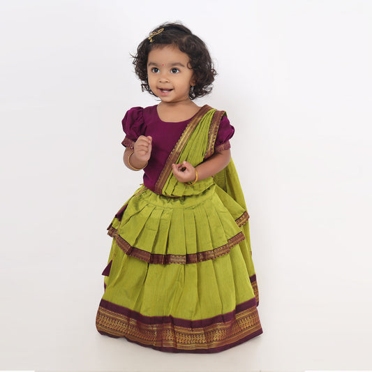 Green and wine traditional half saree for girls, ethnic wear for baby girl (100% Pure Cotton)