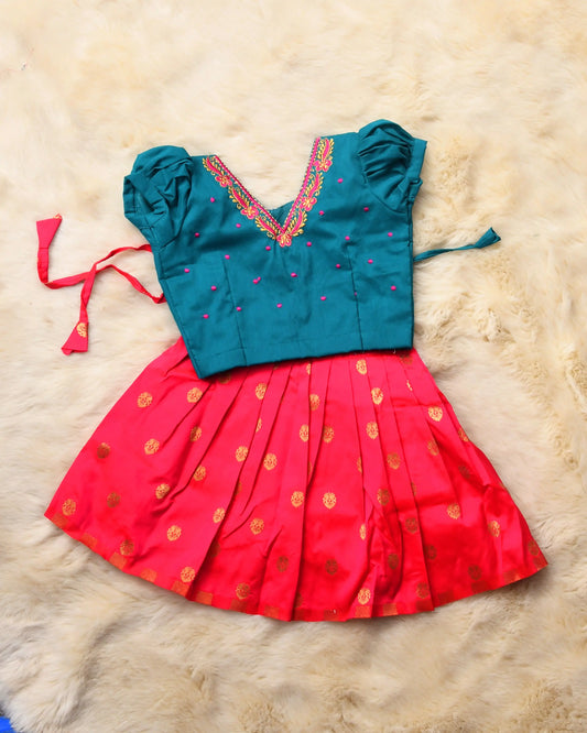 Pink and ananda blue silk south indian ethnic wear langa blouse for baby girl