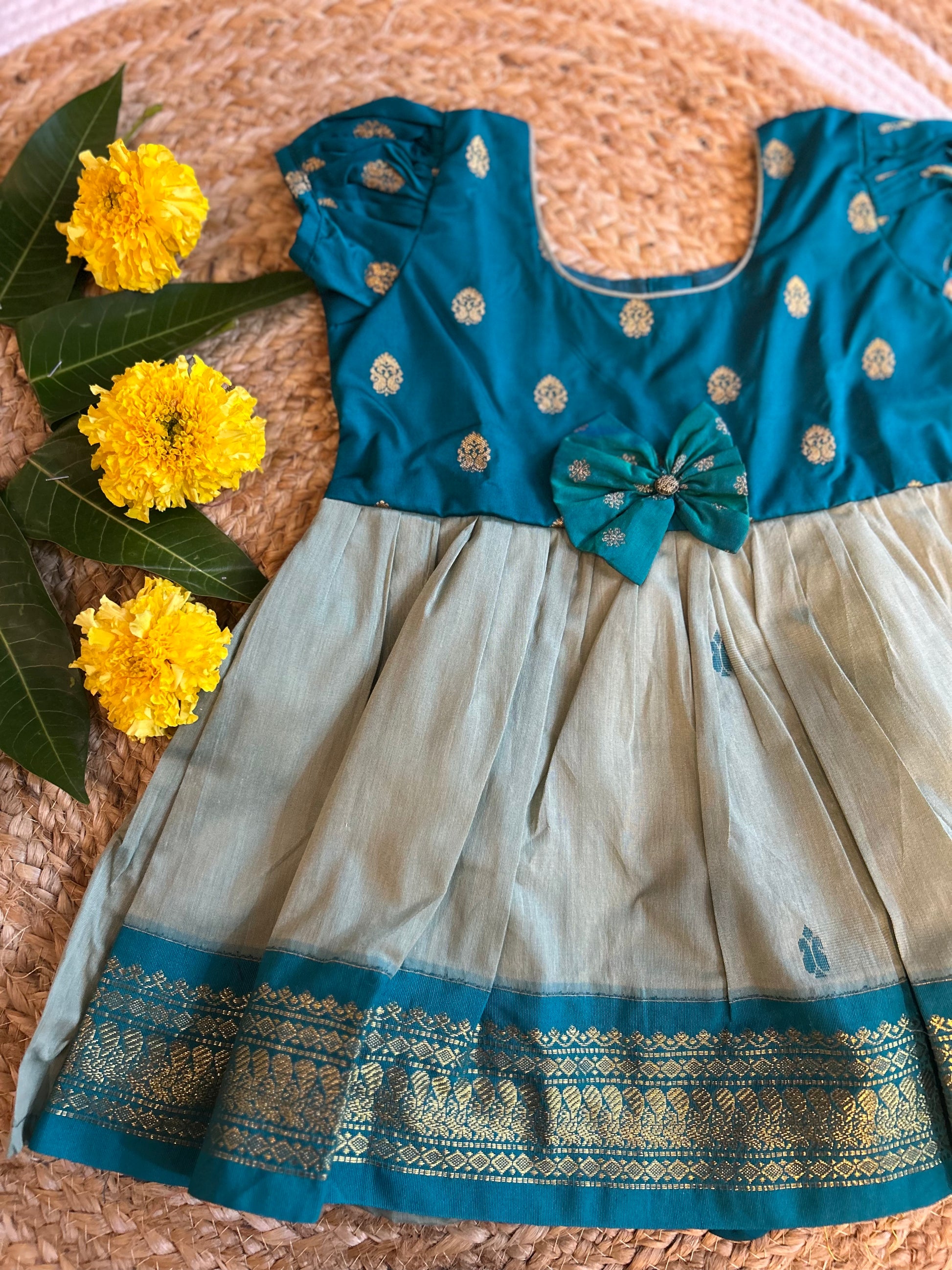 Aqua Blue with light gray (vintage bow) - Kanchi cotton ethnic Wear Frock for Baby Girl