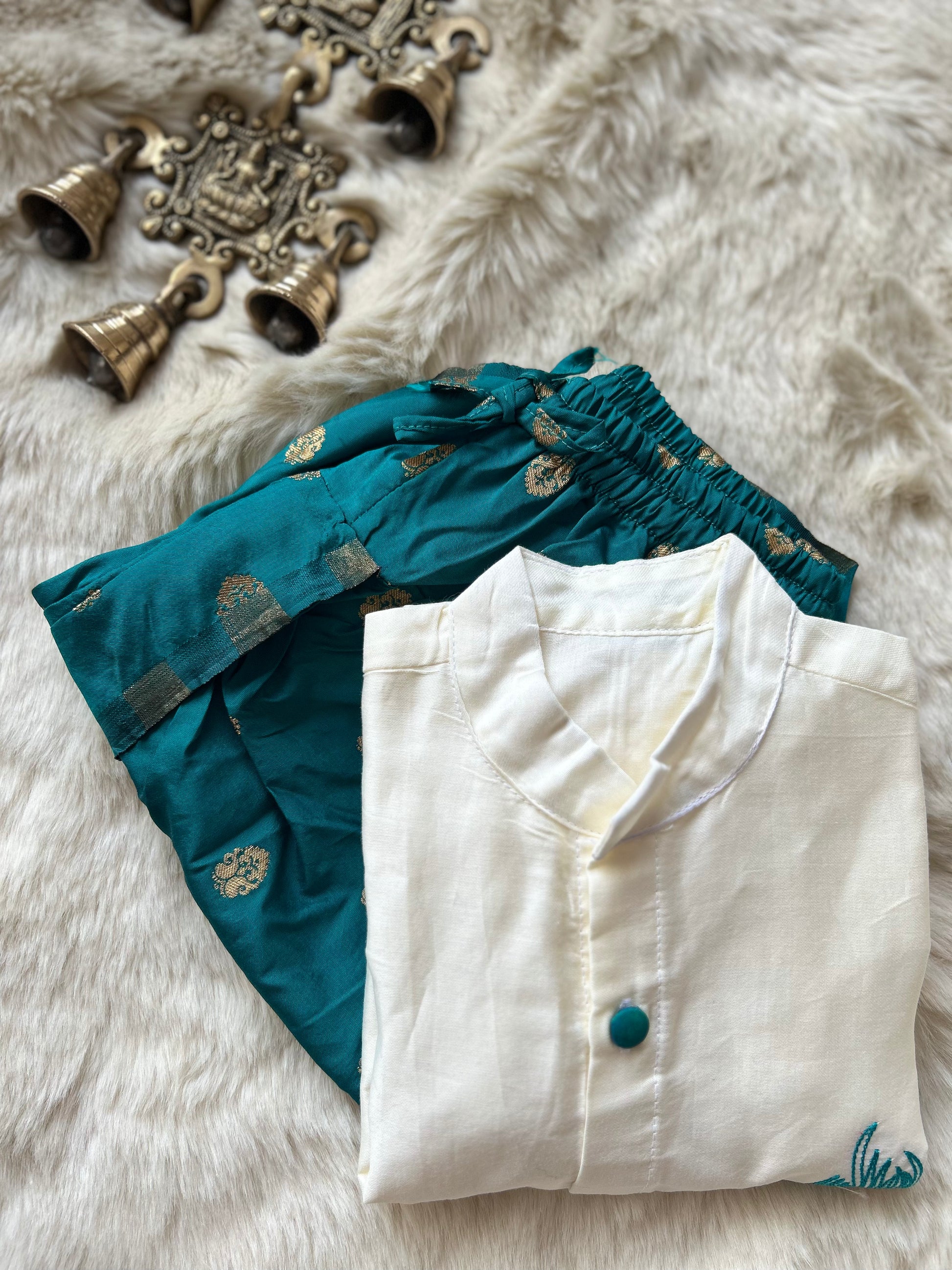 Baby Boy Krishna Dress (Big Butta) - White and peacock blue feather embroidered kurta dhoti ethnic dress for baby boy