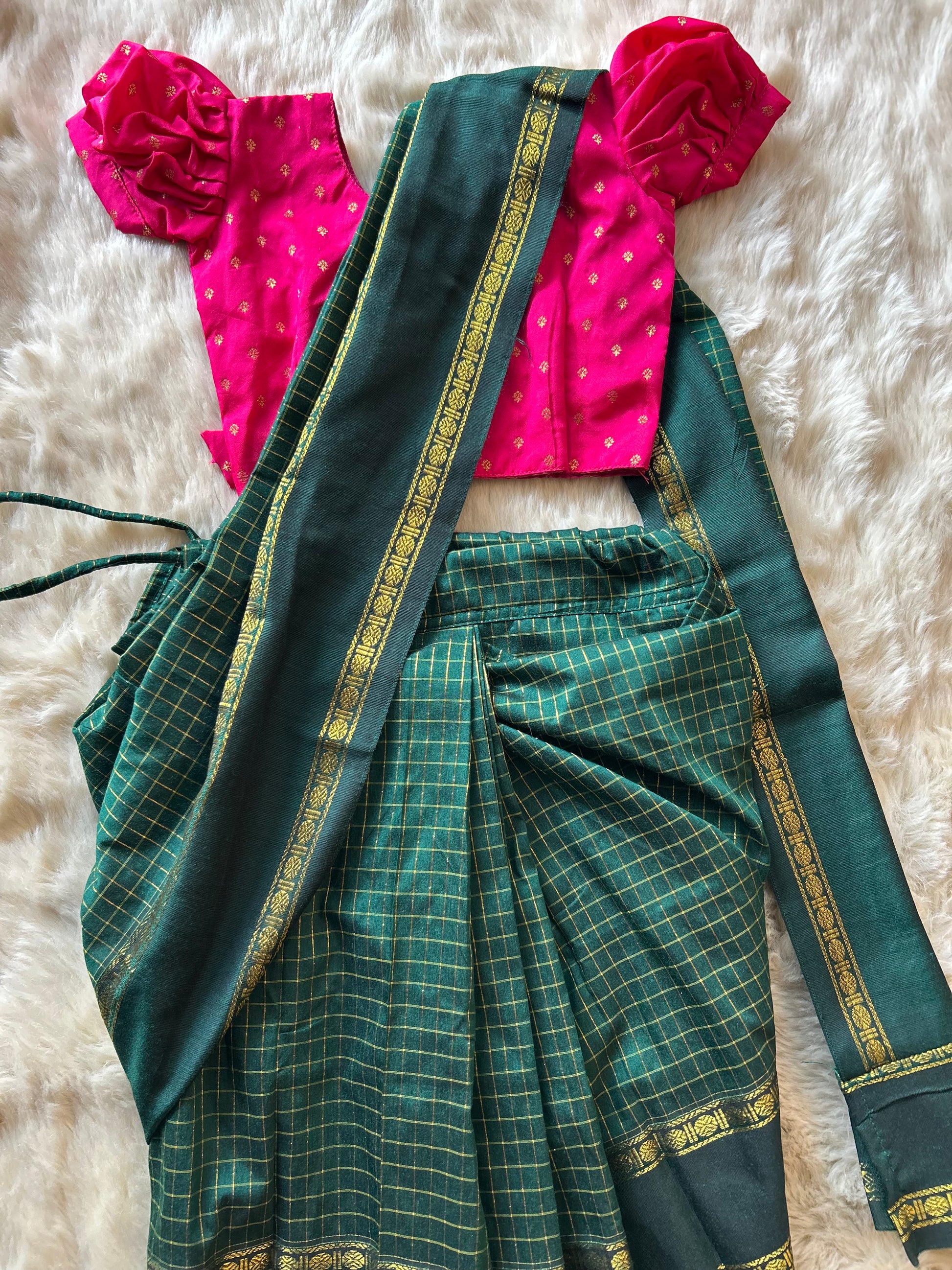 Bottle green with festive pink - Ready to wear muttukattam cotton silk saree for kids Ethnic wear for baby girl