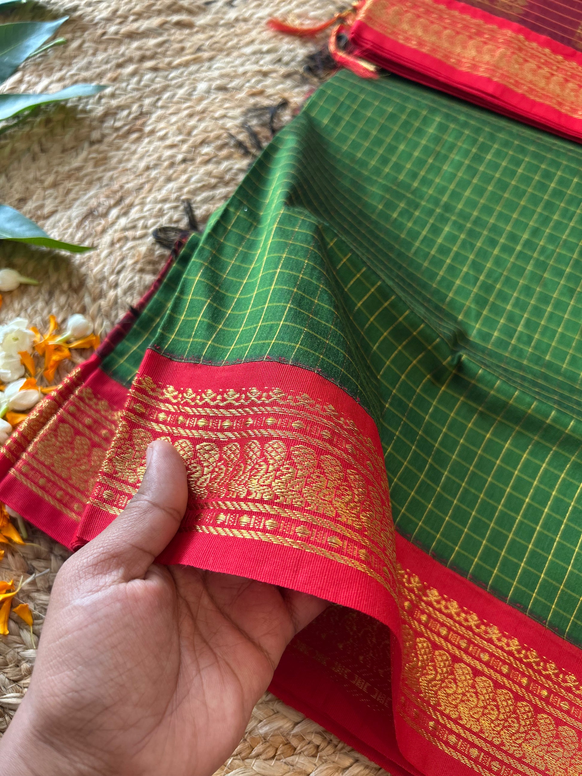Bottle Green with Red - Premium Cotton Silk Saree with Contrast Blouse