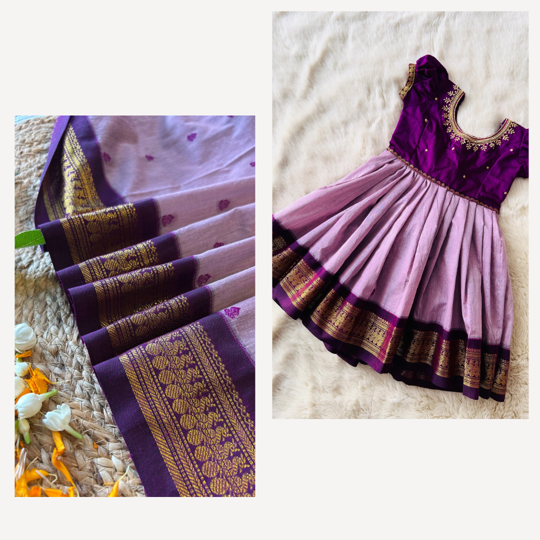 Wine and lavendar - Gown and cotton silk saree mom and daughter combo set